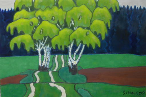 schaftsportraits und Szenen entstanden. Es werden die wichtigsten Strukturen des Gesehenen aufgezeigt, zugleich aber Verfremdungen vorgenommen und eigenwillige, teilweise symbolhafte Akzente gesetzt. Viele Bilder gehen auf Workshops mit zwei Malfreunden zurück, die nach Seedorf am Schaalsee oder nach Katalonien, Umbrien und auf die Insel Langeland führten.